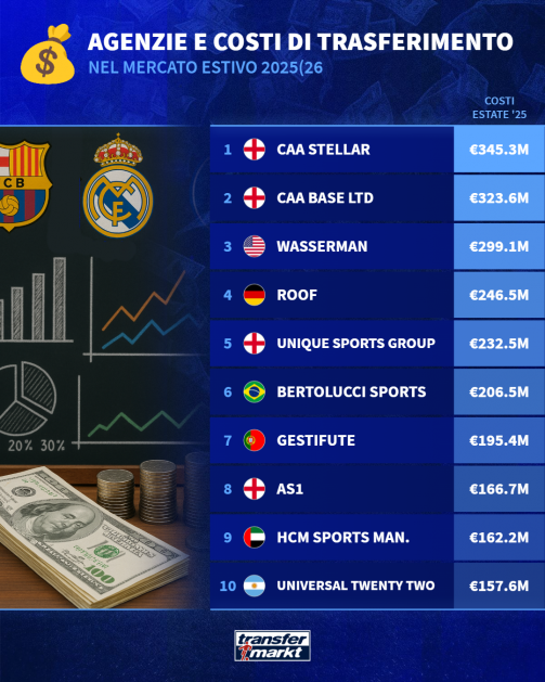 Il valore di mercato restituisce una fotografia del peso economico dei calciatori assistiti ma un parametro significativo è rappresentato dal volume delle operazioni concluse. Nel mercato estivo 2025/26, storicamente più incisivo rispetto alla sessione invernale soprattutto per tempistiche e disponibilità economica delle varie squadre, la CAA Stellar si è attestata al primo posto per valore complessivo dei trasferimenti, raggiungendo la cifra di 345,3 milioni di euro. Al secondo posto, invece, si trova la CAA BASE LTD, che ha raggiunto 323.6 milioni di euro. Medaglia di bronzo per gli americani della Wasserman che per poco non hanno sfondato il tetto dei 300 milioni fermandosi a 299.1.